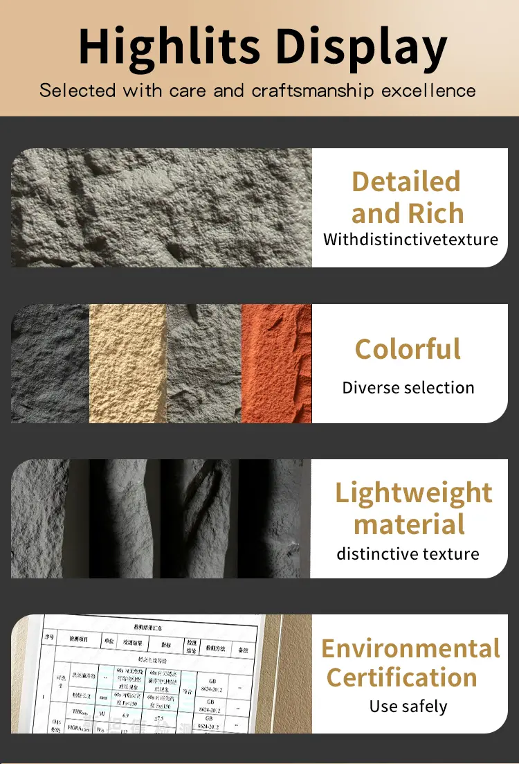 Lightweight and High Strength: PU cultural bricks are made of polyurethane material, which has the characteristics of light weight and high strength, making them easy to construct and transport.